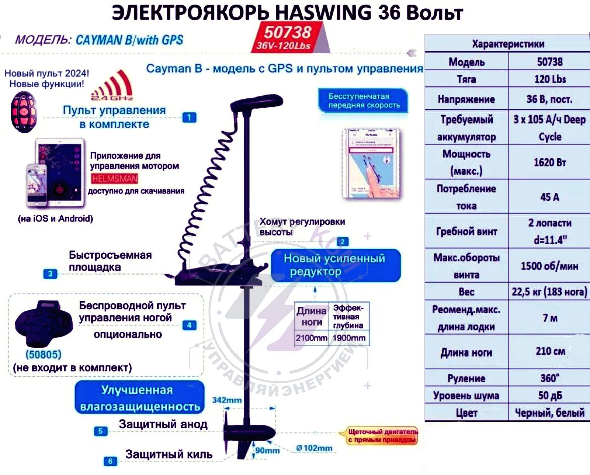 Модель 2024 года Haswing Cayman-B 120 GPS / 36V / 210 см (50738) с режимом «электронный якорь», поддержкой приложения Helmsman и управлением от пульта дистанционного управления. Конструкция двигателя оснащена анодной защитой и герметизированной электроникой. Стандартно поставляется со всем необходимым для установки на лодку или с помощью быстросъемного крепления (приобретается отдельно). Все двигатели оснащены светодиодным индикатором заряда батареи и 1,5-метровым проводом питания с выключателем. Цифровой регулятор скорости DIGIMAX экономит заряд батареи и максимально увеличивает время пребывания в воде. Обеспечивает плавное бесступенчатое регулирование скорости. Электронная функция безопасности предотвращает ложные пуски при первоначальном подключении к аккумулятору. Функция Full Motor Pilot Control (включает все функции дистанционного радиоуправления также на вашем мобильном телефоне или планшете).